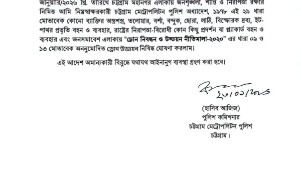 চট্টগ্রাম নগরের পলোগ্রাউন্ড মাঠে বাংলাদেশ জাতীয়তাবাদী দল (বিএনপি) আয়োজিত জনসমাবেশকে কেন্দ্র করে চট্টগ্রাম মহানগর এলাকায় জনশৃঙ্খলা ও নিরাপত্তা রক্ষায় বিশেষ নিষেধাজ্ঞা জারি করেছে চট্টগ্রাম মেট্রোপলিটন পুলিশ (সিএমপি)। শুক্রবার (২৩ জানুয়ারি) রাতে সিএমপি কমিশনার হাসিব আজিজ স্বাক্ষরিত গণবিজ্ঞপ্তি জারি করা হয়। গণবিজ্ঞপ্তিতে জানানো হয়, ২৪ ও ২৫ জানুয়ারি চট্টগ্রাম মহানগর এলাকায় কোনো ব্যক্তি অস্ত্রশস্ত্র, তলোয়ার, বর্শা, বন্দুক, ছোরা, লাঠি, বিস্ফোরক দ্রব্য, ইট-পাথর বহন ও ব্যবহার করতে পারবেন না। একই সঙ্গে রাষ্ট্রের নিরাপত্তাবিরোধী কোনো বস্তু প্রদর্শন, প্ল্যাকার্ড বহন ও ব্যবহার নিষিদ্ধ করা হয়েছে। এ ছাড়া জনসমাবেশ এলাকায় ‘ড্রোন নিবন্ধন ও উড্ডয়ন নীতিমালা-২০২০’ এর ধারা ৯ ও ১৩ অনুযায়ী অনুমোদন ছাড়া ড্রোন উড্ডয়ন সম্পূর্ণ নিষিদ্ধ ঘোষণা করা হয়েছে।